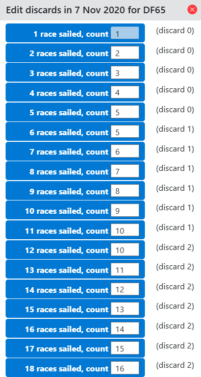 Throwouts or discards. Particularly in model racing, where we often have boat problems or get weed wrapped around the keel we want the ability to discard some of those results. Some events choose to discard one in every three, others one in every six or some other number. We decided that, since the number of races we run each series can vary, the best option is to have a progressive discard schedule. So the system does this.